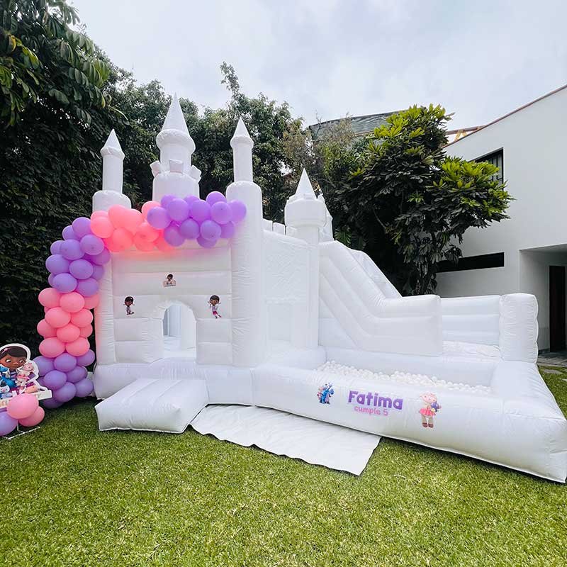 No alquilamos inflables genéricos. Cada uno viene en blanco y nuestro equipo diseña vinilos personalizados con los colores, personajes y decoración que solicites. - Servicio completo de montaje y supervisión
